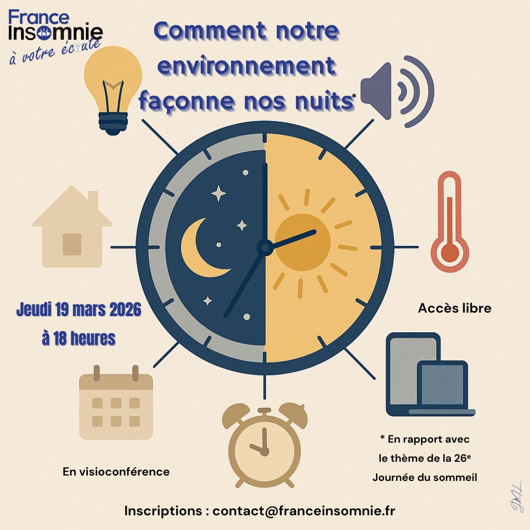 Espace de partage et d’entraide destinés aux personnes souffrant d’insomnie, animé par des patients experts, cofondateurs de l’association ; le thème choisi est celui de la Journée du Sommeil : Sommeil, rythmes et environnement : l’équilibre fragile.